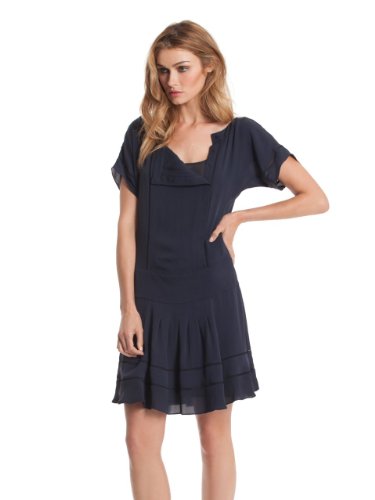 Modes silk crepe this classic silhouette for a style must-carry. Flaunt it off-the-shoulder for a casual look with a chic appeal-leather jacket liner and take this dress in autumn. ? Silk crepe dress. Boat neckline. Short sleeves. ? Pleated panel to f